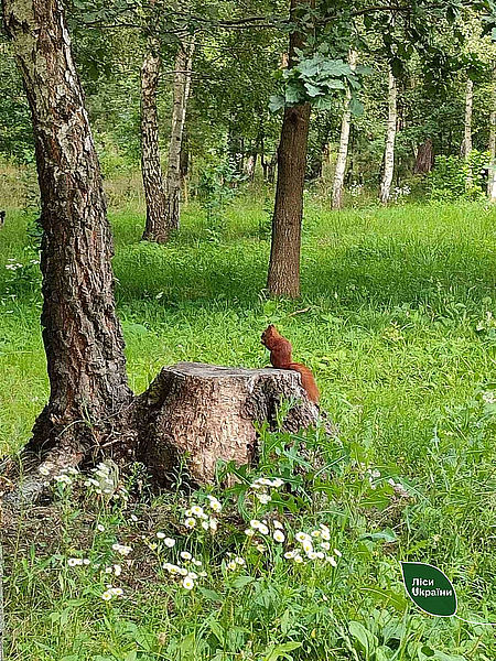«Руда білка впевнено влаштувалася на старому пеньку посеред сонячної галявини. Поки вона зосереджено ласує знайденим горішком, білокорі берези на задньому плані створюють затишну лісову декорацію. Це мить тихої гармонії, де пухнастий мешканець лісу почувається справжнім господарем».